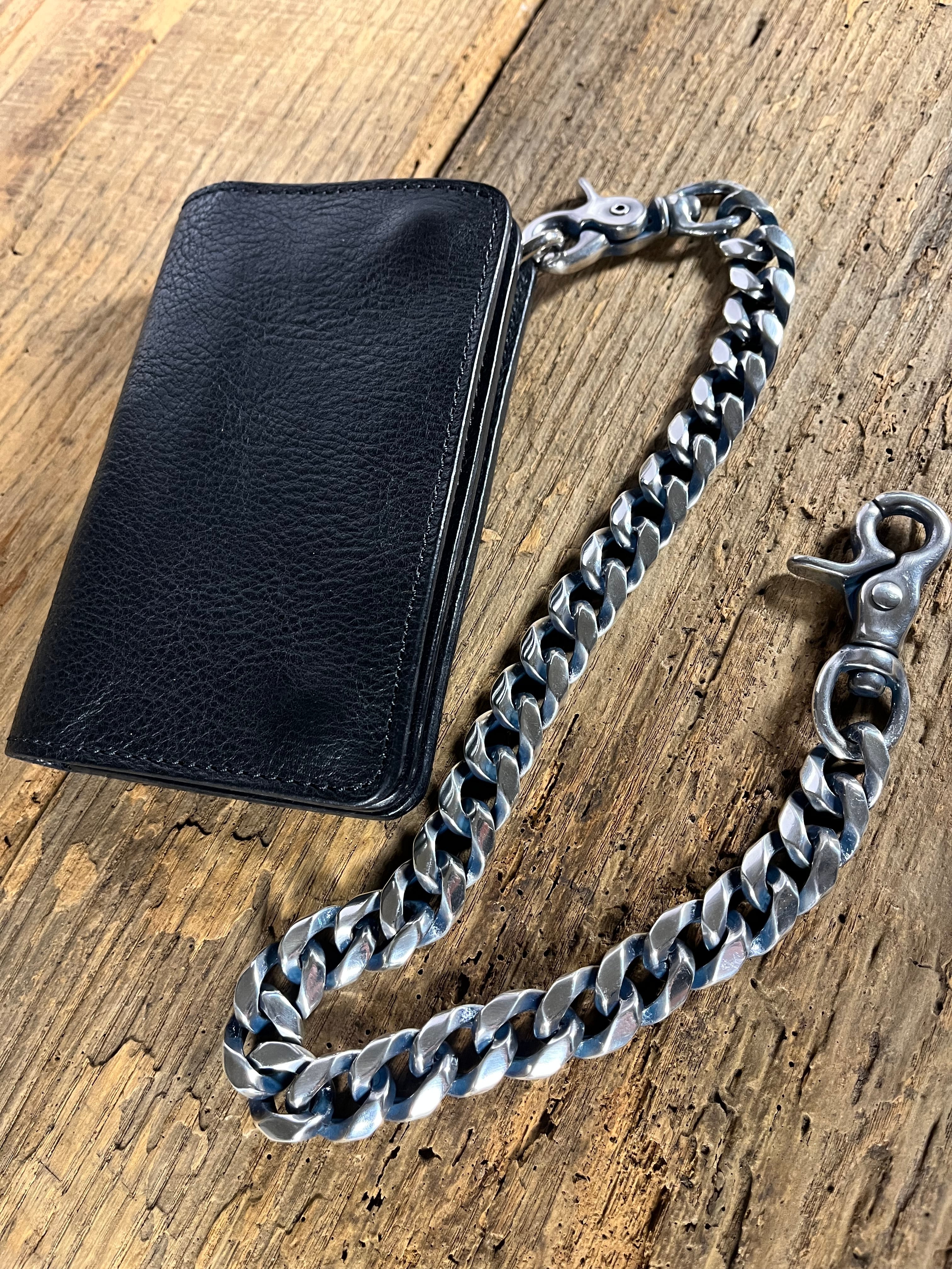 ウォレットチェーンも取付可能ですので、購入時にハトメ穴の有無とシャックルカン(有料)のオプションも選択して頂けます。
